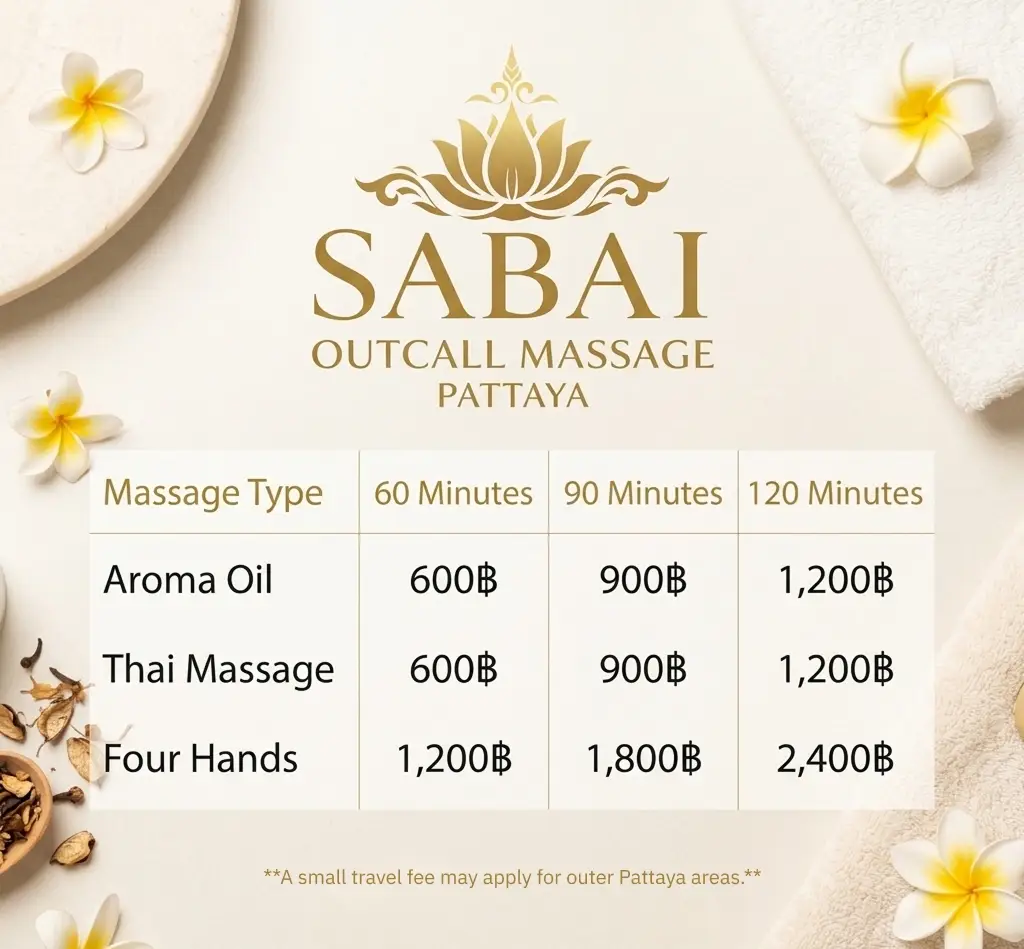 Welcome to SABAI Out Call Massage – Pattaya’s premier mobile spa delivering ultimate relaxation directly to your door. Every treatment is provided by fully certified therapists with over 5 years of professional experience.